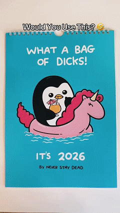 🤘😊🍆'Ich habe mir geschworen, keinen 'dummen' Wandkram mehr zu machen - meine Schwester hat mir diesen Kalender geschenkt. Dieser cocktailschlürfende Pinguin? Dafür lohnt es sich, meine 'erwachsene' Einstellung aufzugeben. Ich liebe dich, Regelbrecher.'🙌