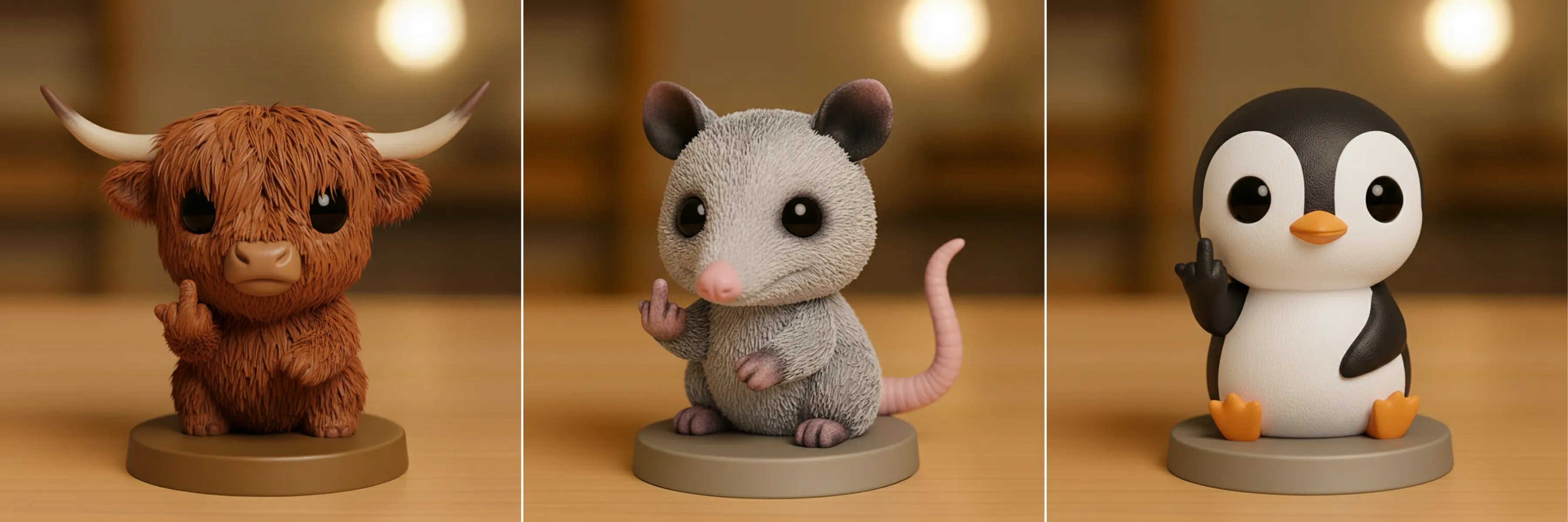 😇Each finely crafted resin figurine features a beloved creature—from a grumpy Highland cow to a sassy penguin—proudly flipping the bird with unapologetic style.
