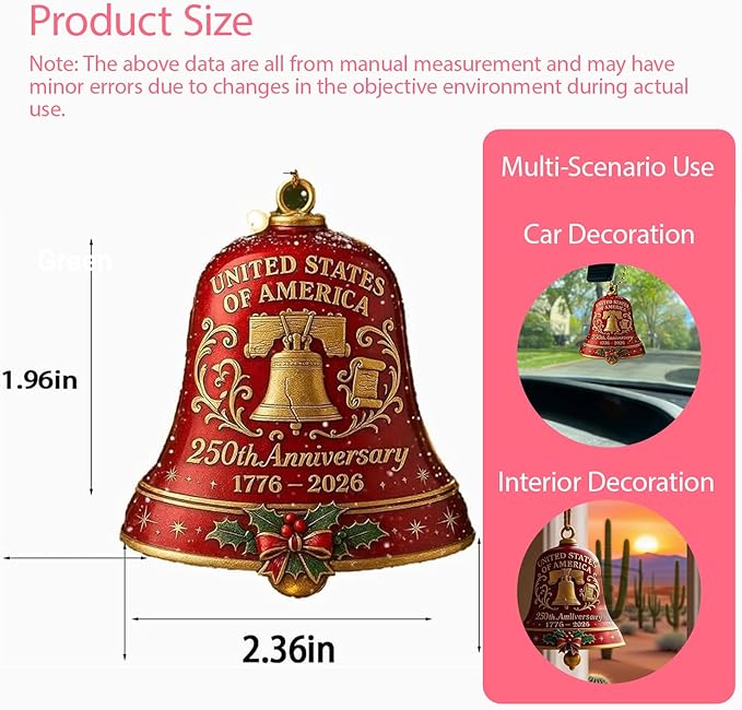 🔔Celebrate a historic milestone with the United States 250th Anniversary Bell Ornament. Expertly crafted, this elegant ornament features commemorative detailing, making it a timeless keepsake for collectors and patriotic displays alike. Ideal for honoring America's significant anniversary.