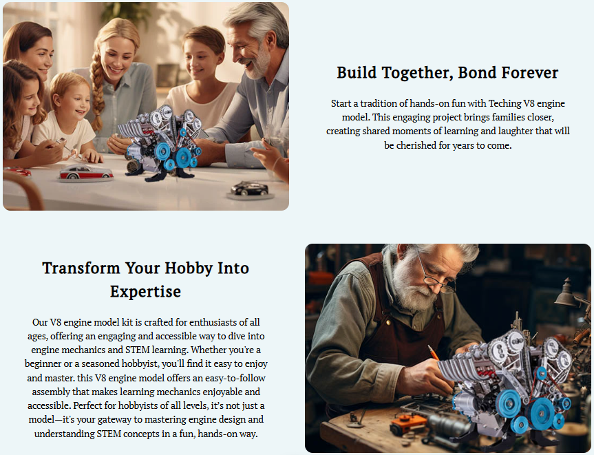 Exquisite Model Details: This V8 engine model kits are mode of highly textured metal parts. The alloy golden color make it more real. While Building, you can know more about the wonderful mechanical engineering world.