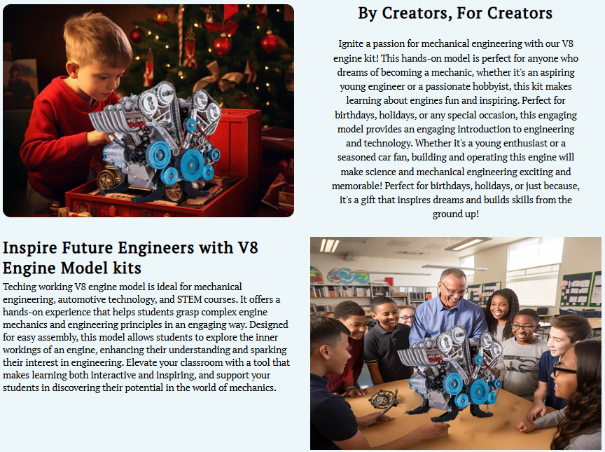 Story Origin: To show the respect, this Teching v8 engine is based on the ideas of the the first 8-cylinder engine in the United States, letting more kids to know more about how it works.