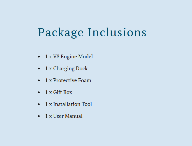 Simulation Model: The V8 engine can be driven by a motor, which is more realistic and interesting. When you observe the engine running process, it's not only an exquisite decoration model, but a simulative dynamic model that can simulate the operation of a real car engine.